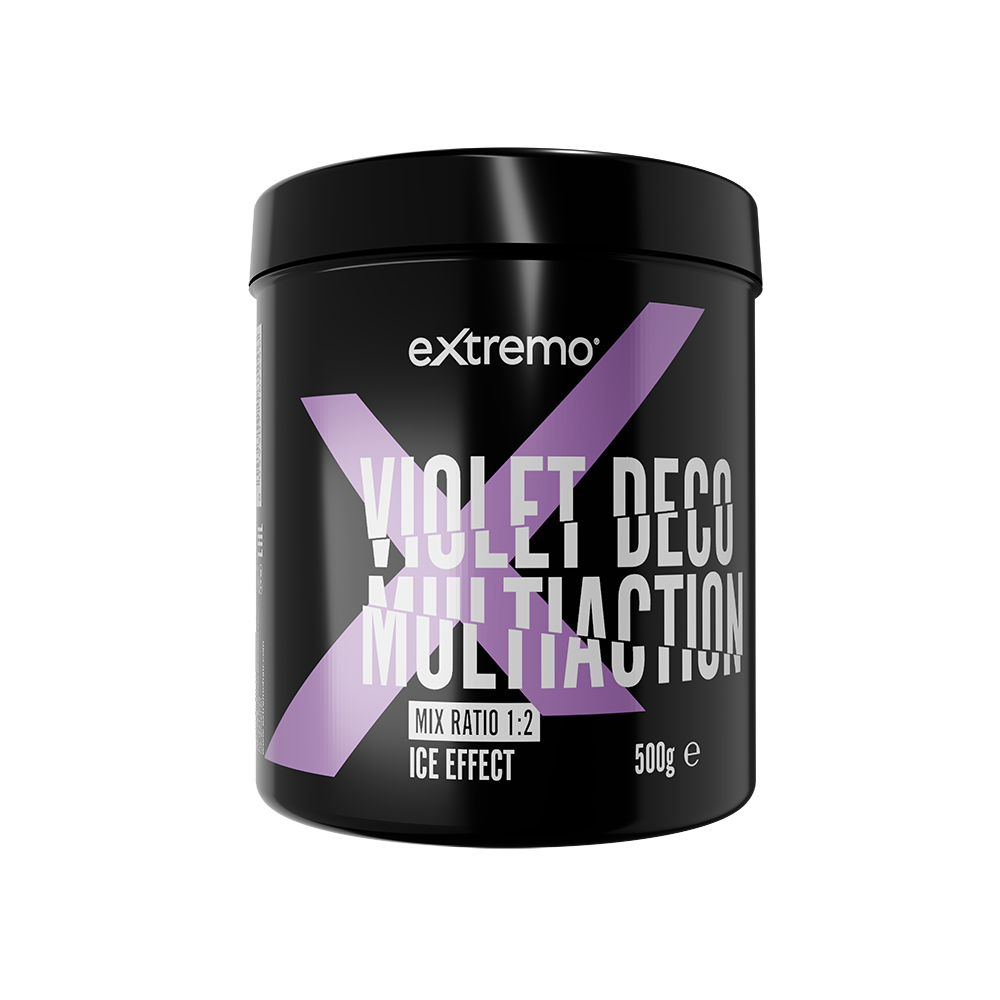 Violet Deco Multi Action is a non-aggressive bleach with a low ammonia content with a heavy non-volatile powder enriched with polysaccharides and fruit sugars. The lightening power is high, without drying out the hair.
